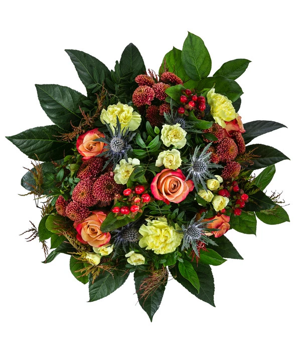 Wenn der Herbst langsam in der Natur Einzug hält, verbringen viele Menschen ihre Zeit gerne gemütlich beisammen bei einem heißen Getränk und genießen die Ruhe und die bunten Farben. Wer dieses Gefühl gerne mitbringen oder ins eigene Haus holen möchte, auch an stressigen Tagen, der kann sich mit dem Blumenstrauß Herbsttraum die Entspannung ins Haus holen. Ein hübsches Arrangement aus typischen Herbstblumen wie Chrysanthemen zusammen mit Disteln, hellen Nelken, orangen Rosen, grünem Laub und weiteren schönen Pflanzen bringt den Charme des Herbstes mit und verbreitet Freude. Schenken Sie einem lieben Menschen diesen schönen Strauß als kleine Aufmerksamkeit oder schmücken Sie damit stilvoll Wohnung oder Büroräume.