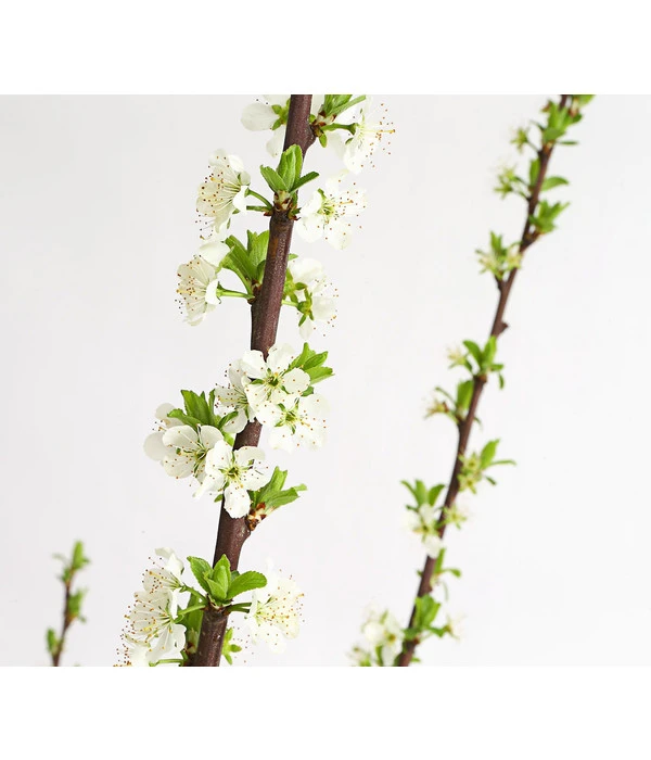 Die Aprikosenmirabelle ‚Aprimira‘ ist keine Kreuzung aus Aprikose und Mirabelle, wie man vermuten würde. Sie stammt auf jeden Fall von der Mirabelle ‚von Herrenhausen‘ ab, welche von einer Pflaume bestäubt wurde. ‚Aprimira‘ hat also mit Aprikosen gar nichts zu tun, bis auf den ähnlichen Geschmack. Die Früchte sind gelb-orange und haben sonnenseits rosa-violette Bäckchen. Ihre Größe und die länglich-ovale Form erinnern an Pflaumen. Das Fruchtfleisch ist gelblich, fest und honigsüß mit einem leichten Aprikosenaroma. Auch die Blüten erinnern eher an Zwetschgen, sie sind sehr klein, weiß und in einer hohen Anzahl an der Pflanze verteilt. Da die Blütezeit sehr früh ist, sind die Blüten etwas Spätfrost gefährdet. Geerntet werden die leckeren Früchte übrigens zwischen August und September. Man spricht bei ‚Aprimira‘ von einer Verbesserung der Mirabelle ‚von Nancy‘, denn sie ist größer und hat ein feineres Aroma.