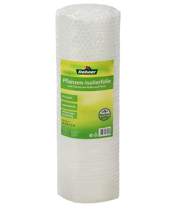 Oleander, Hibiskus, Bougainvillea und nicht zu vergessen Ihre schönen Rosenstämmchen in den großen Blumenkübel – diese Pflanzen müssen den Winter oft aus Platzgründen draußen verbringen, brauchen aber unbedingt einen warmen ‚Mantel‘, um die frostigen Monate gut zu überstehen. Mit der Dehner Pflanzen-Isolierfolie bringen Sie Ihre Pflanzen gut durch die kalte Jahreszeit. Die Dehner Pflanzen-Isolierfolie ist UV-stabil, lichtdurchlässig, wasserdicht und reißfest. Dank der 4 mm Luftpolster ist die Folie sehr gut wärmeisolierend und zudem stoßdämpfend. Außerdem ist das Handling mit der Dehner Pflanzen-Isolierfolie denkbar einfach.