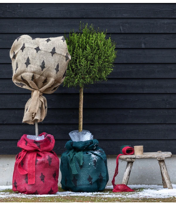 Bei der Dehner Pflanzen-Isolierfolie handelt es sich um eine 5 m hohe Bahn, die Sie einfach um die Pflanze und oder den Topf wickeln und dann fixieren. Sie können Ihren wertvollen Kübelpflanzen aber auch eine kleine Schutzhütte bauen. Stecken Sie dazu 3 oder 4 stabilen Stäbe in den Boden und wickeln die Folie sauber um die Stäbe, dann noch einmal als ‚Dach‘ eine horizontale Bahn legen – und schon ist das Winterquartier fertig. Stehen die Kübelpflanzen an Stellen, die Sie auch im Winter oft und gut sehen können, sollten Sie die Töpfe zusätzlich mit Schmuckbändern und zur Weihnachtszeit mit hübschen Lichterketten verzieren. Auf dieser Weise sorgen Sie an verschiedenen Stellen im Garten oder auf der Terrasse für einen stimmungsvollen Blickfang.
