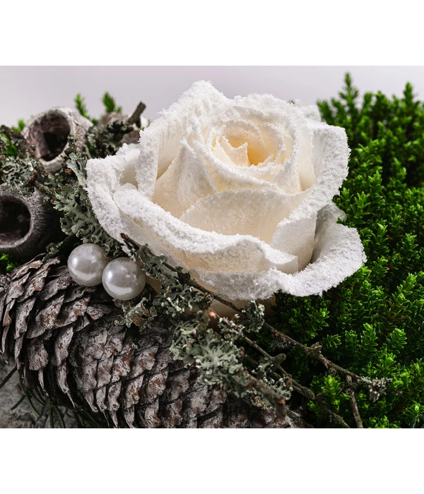 Auf einem üppigen Bett aus frischen Tannen- und Kiefernzweigen wurden erlesene Deko-Elemente wie eine weiße Kunstrose, getrocknete Palmblätter, Fichtenzapfen und Zweige, aber auch Polstermoos, Canella und Co stilvoll platziert. Dank der bizarren Zweige des Zickzack-Strauchs (Corokia) und dem prachtvollen Strelitzienblatt erreicht das Gesteck eine stattliche Höhe von ca. 55 cm, sodass sich das Grabgesteck Stille auch als Winterschmuck für größere Grabstätten und Familiengräber eignet. Den liebenswerten Blickfang der Komposition aber bildet die kleine Engelsfigur mit Trauerspruch, die als geheimnisvoller Mittler zwischen Himmel und Erde gilt. Da unsere Floristen bei der Wahl der Materialien aber nicht nur auf den dekorativen Wert, sondern auch auf die Haltbarkeit geachtet haben, können Sie sicher sein, dass das Grabgesteck Stille auch Regen, Frost und Schnee ungerührt über sich ergehen lassen wird und das Grab Ihrer Lieben zuverlässig schmücken wird – bis ins neue Jahr hinein.