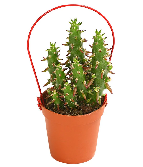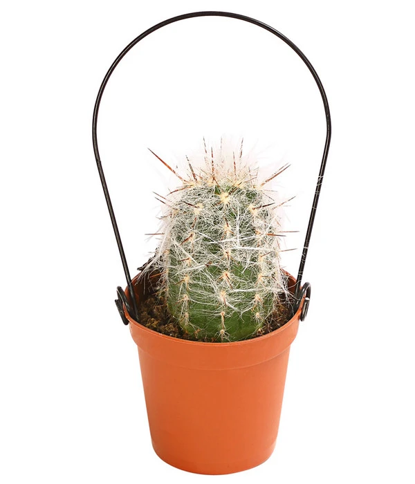 Die Vielfalt der Wuchsformen ist fantastisch, finden Sie nicht auch? Knubbelig oder aufrecht wachsend, solo oder mit zahlreichen Nebensprossen und natürlich mit mehr oder weniger gefährlichen Stacheln „bewaffnet“. Und dann haben wir noch gar nicht die tollen Blüten erwähnt, mit denen sich Kakteen schmücken können, wenn sie sich wohl fühlen. Kein Wunder, dass es im Moment einen richtigen Boom um die stacheligen Gesellen gibt, von dem auch Sie sich ruhig anstecken lassen dürfen. Denn Kakteen sind nicht nur ein kurzfristiger Deko-Trend, so manch einer hat auf diesem Wege schon sein Herz an die unkomplizierten Wüstenbewohner verloren und es wurde eine Wohngemeinschaft auf Lebenszeit. Besonders faszinierend wirken diese Pflanzen aber, wenn sie sozusagen noch in den Kinderschuhen stecken. Deshalb bieten wir Ihnen hier einen Mix aus verschiedenen Mini Kakteen, die neben eigenwilligem Wuchs und Stacheln eines gemeinsam haben: sie stecken in einem Topf mit Bügel. Tragen Sie gleich mehrere Mini Kakteen am Bügel nach Hause, denn je zahlreicher die Gesellschaft ist, die Sie um sich versammeln, umso beeindruckender ist die Deko-Wirkung!