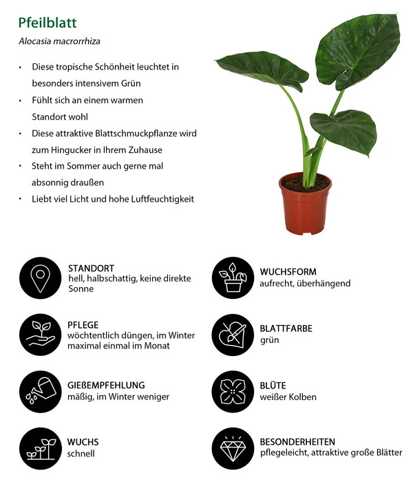 Damit Ihr neuer Zimmerpflanzen-Star sich auch rundherum wohlfühlt, ist es Ihnen sicher wichtig zu wissen, welche Ansprüche er stellt. Und Sie werden überrascht sein, wie einfach so ein Pfeilblatt zufriedenzustellen ist. Als Standort sollten Sie ein halbschattiges Plätzchen wählen, an dem es keine direkte Sonne gibt. Achten Sie beim Gießen darauf, dass die Erde erst abtrocknet, bevor wieder gegossen wird, lassen den Topfballen aber niemals austrocknen. Wenn Sie Ihre Alocasia macrorrhiza so richtig verwöhnen wollen, gönnen Sie ihr ab und zu einen warmen Sommerregen oder eine Dusche.