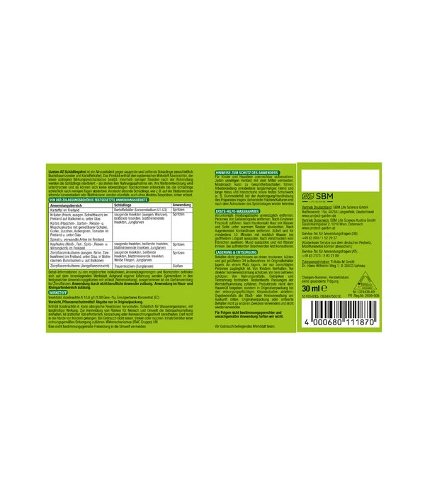 Mit PROTECT GARDEN Schädlingsfrei Lizetan® AZ können Sie gegen alle saugenden und beißenden Schädlinge wie • Buchsbaumzünsler, • Kartoffelkäfer, • Spinnmilben, • Zikaden und • Blattläuse vorgehen und einen sofortigen Fraß- und Saugstopp auslösen und wenig später sind die Schädlinge auf Nimmerwiedersehen verschwunden. Sie können das Schädlingsbekämpfungsmittel sogar im Haus gegen Trauermücken-Larven an Zimmer- und Kübelpflanzen einsetzen. Der bewährte Wirkstoff in PROTECT GARDEN Schädlingsfrei Lizetan® AZ besteht aus nachwachsenden Rohstoffen, wirkt zuverlässig gegen die Schädlinge, ist aber bienenschonend.