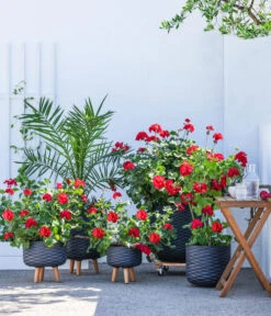 Lassen Sie die rote Geranie Kästen und Kübel in ein faszinierendes Blütenmeer verwandeln und ergänzen Sie die Blütenpracht mit Kübelpflanzen wie einer Engelstrompete, einem Oleander und einer Paradiesvogelblume. Dank des aufrechten Wuchses mit den kompakten Stängeln wird die Geranie sogar in Beeten, um Beispiel gleich neben der Terrasse wunderbar gedeihen.